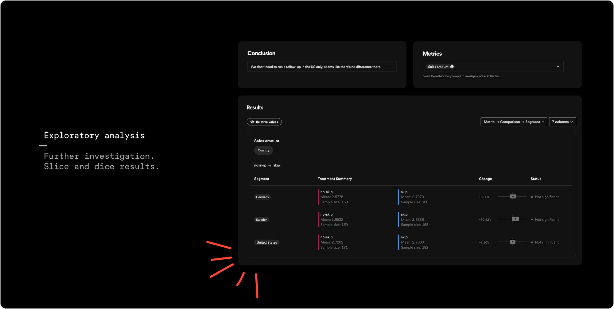 With Confidence, what you can learn from your experiment won't come to a halt just because it's ended. In many situations, your experiment's results will warrant further investigation. For example, you might have gotten a surprisingly good result and want to understand if all types of users shared this great improvement or not. Or you might have found almost no effect, and you want to understand if there are some specific groups that benefited from the variant you tested that might shed light on how to iterate. In any case, Confidence's exploration page has got you covered. On the exploratory page, you can slice and dice the results by the dimensions you create. These dimensions can exist directly on your events that power your metrics, like if an order placed by a user happened on your website or in your app. Dimensions can also describe the entity your experiment is on, such as a country dimension describing the country of registration for your users.