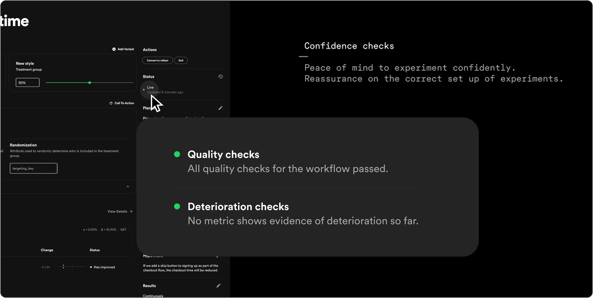 At Spotify, we find that automatically checking business-critical metrics for all experiments enables even more freedom for our hundreds of autonomous experimenting teams. The platform enables these teams to experiment with low friction without compromising quality, effectively acting as a safety net that helps identify regressions. Confidence informs and alerts when something goes awry to enable safe experimentation at scale, promoting speed and autonomy while maintaining safety mechanisms to minimize risks.