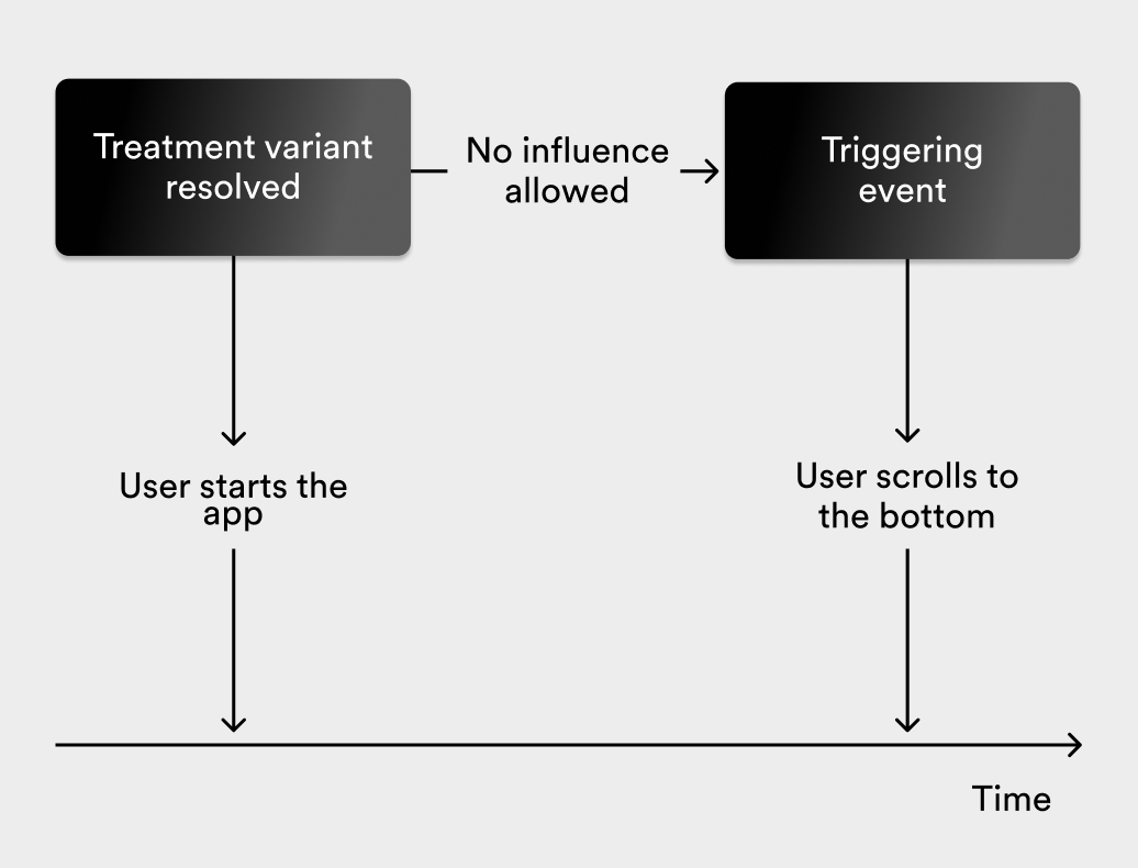 The image above shows how the exposure and triggering events occur in sequence to define the two types of exposure. In the previous section, we described how the resolving behavior differs between different types of clients. For a mobile or web application, the resolving event often occurs on app start. The broad exposure definition that only relies on the exposure events can be further narrowed down by using trigger analysis. Two possible triggers for the playlist example are the events of visiting a playlist or scrolling to the bottom of it.