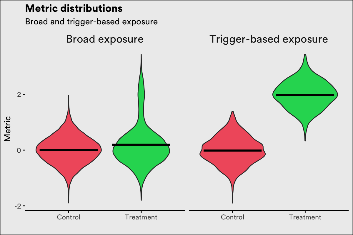 In the previous section, we shared an example on how an effect of 2 units for 10% of the population translates to an effect of 0.2 units for the entire population. In such a scenario, a change of 0.2 units is the effect we should expect if we roll out the change to everyone. With trigger analysis, we'd estimate the treatment effect to be 2 units. This effect is the average treatment effect for the population of users who behave in such a way that they experience the change. The image above shows hypothetical distributions of the metric values in a case like this. With broad exposure, the large population of users that don't experience the change pull the sample mean towards zero. With trigger-based exposure, those users are excluded, and the sample mean is centered on the sample mean in the group of users that experience the change.